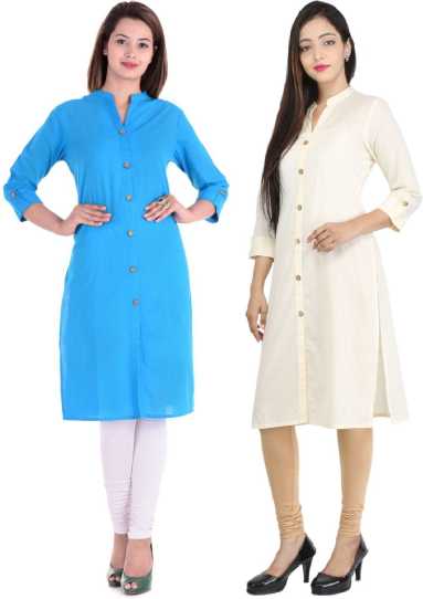 Women Solid Cotton Blend Frontslit Kurta Light Blue, White)