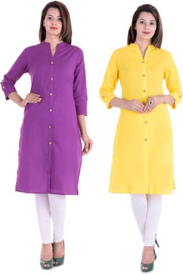 Women Solid Cotton Blend Straight Kurta Purple, Yellow)