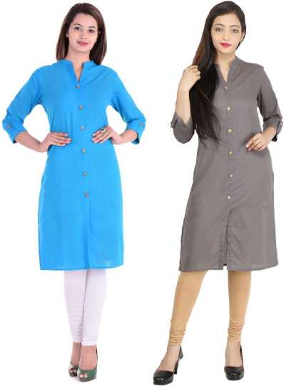 Women Solid Cotton Blend Frontslit Kurta Light Blue, Grey)
