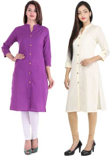 Women Solid Cotton Blend Straight Kurta Purple, White)
