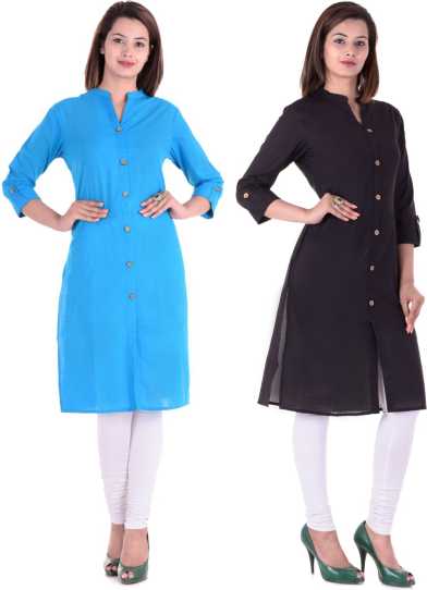 Women Solid Cotton Blend Frontslit Kurta Light Blue, Black)
