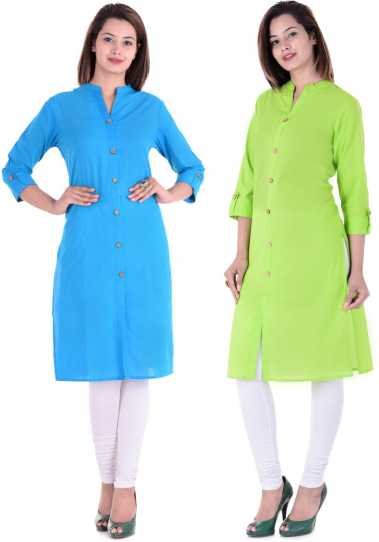 Women Solid Cotton Blend Frontslit Kurta Light Blue, Light Green)
