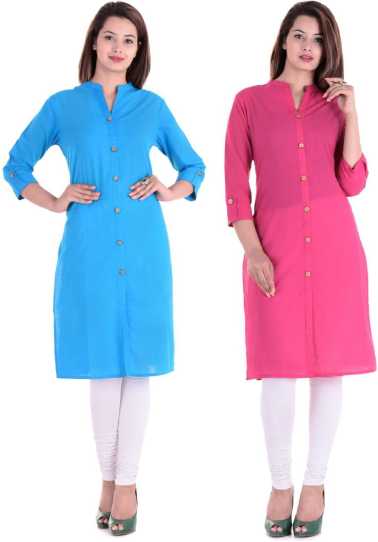 Women Solid Cotton Blend Frontslit Kurta Light Blue, Pink)