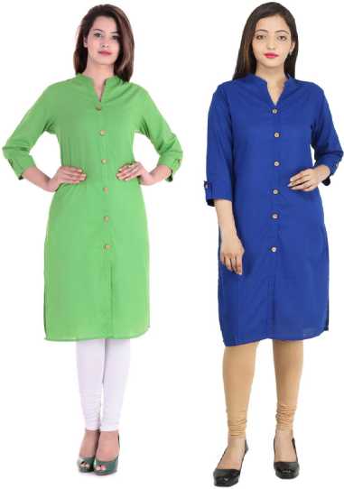 Women Solid Cotton Blend Frontslit Kurta Dark Blue, Green)