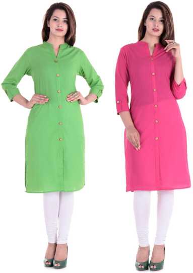 Women Solid Cotton Blend Frontslit Kurta Green, Pink)